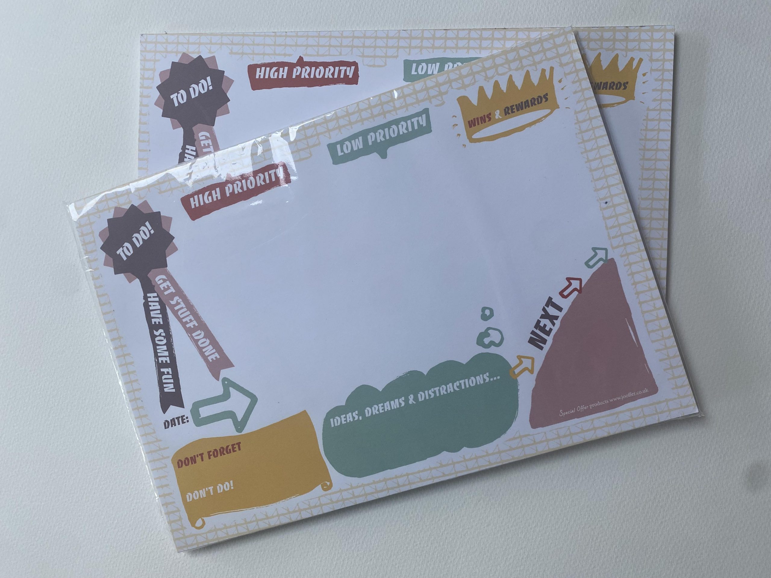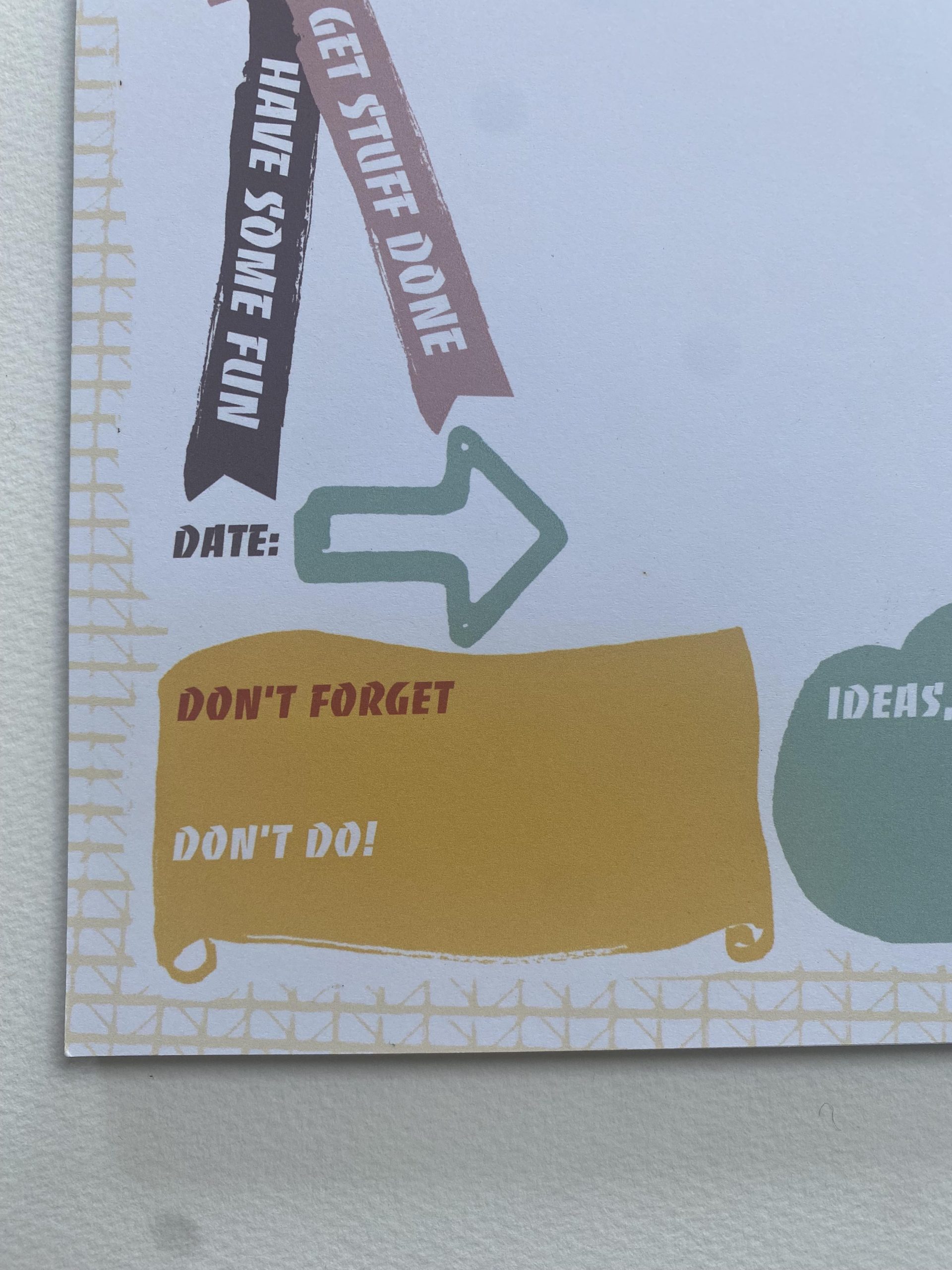 A colourful planner with prompts and visuals designed to support getting things done … and having fun. Designed by and for people who sometimes need a nudge to stay focussed 😉